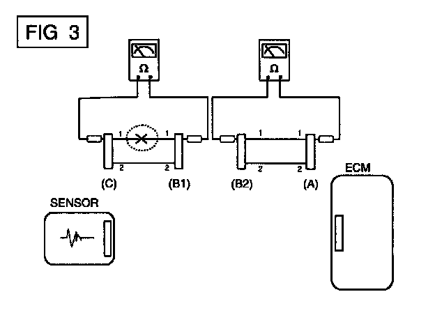 b. Disconnect connector (B), and measure for resistance between connector (C) and (B1) and between (B) and (A) as shown in [FIG. 3].