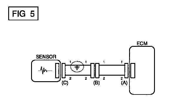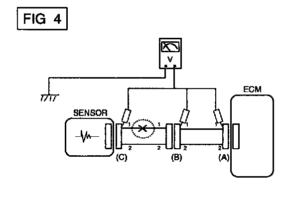 a. With each connector still connected, measure the voltage between the chassis ground and terminal 1 of each connectors (A), (B) and (C) as shown in [FIG. 4].