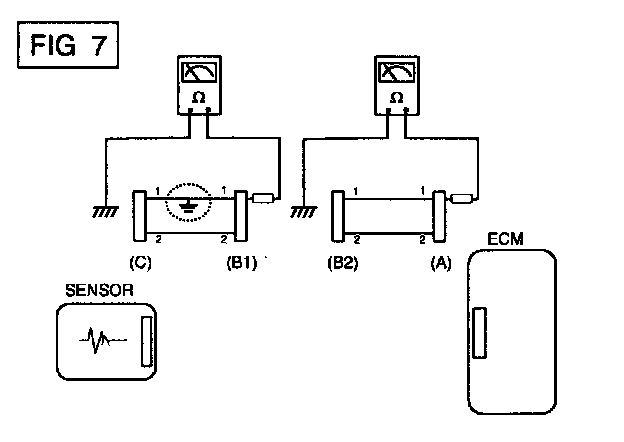 b. Disconnect connector (B), and measure the resistance between connector (A) and chassis ground, and between (B1) and chassis ground as shown in [FIG. 7].