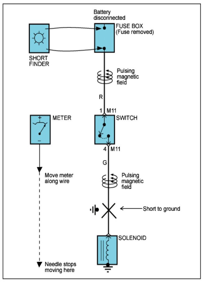 A short finder is available to locate a short to ground. The short finder creates a pulsing magnetic field in the shorted circuit and shows you the location of the short trough body trim or sheet metal.