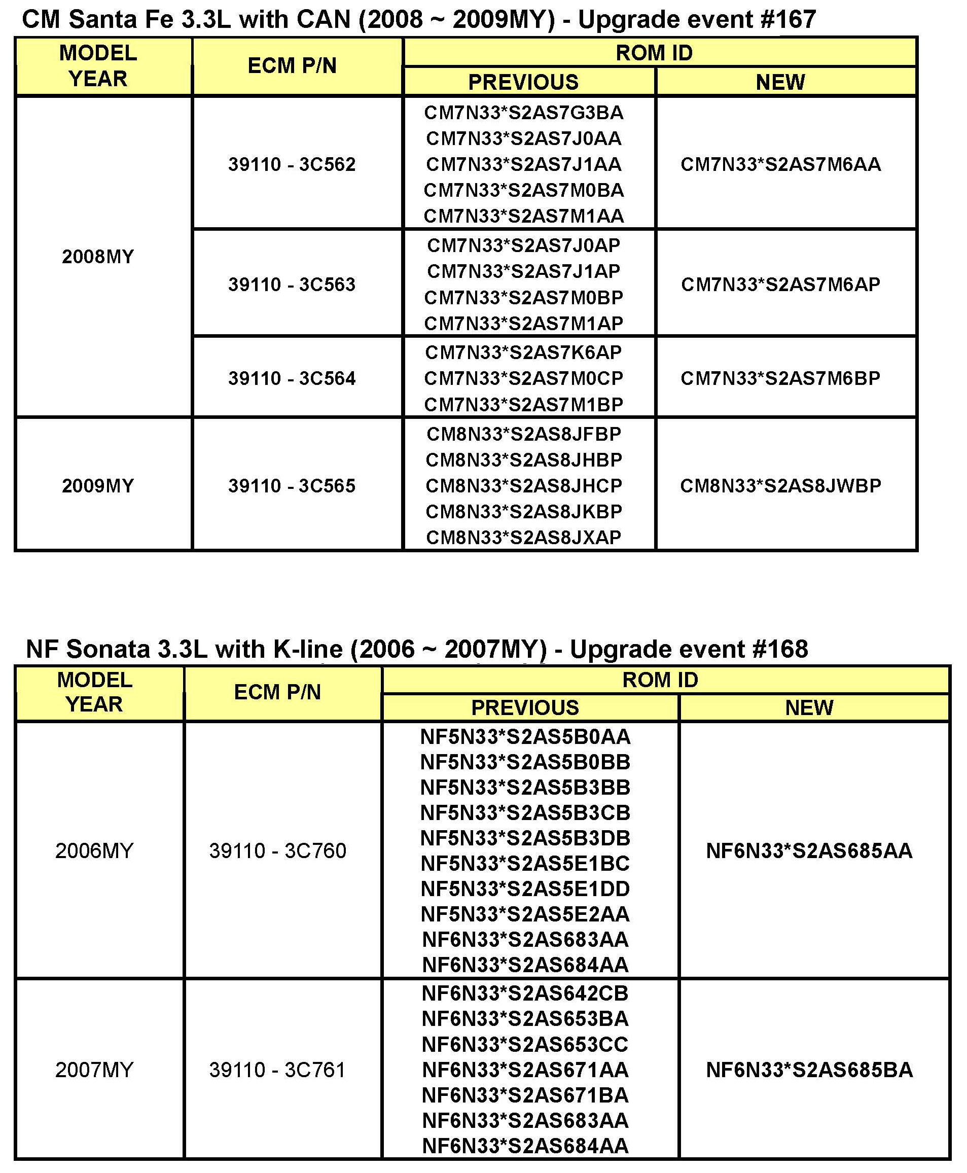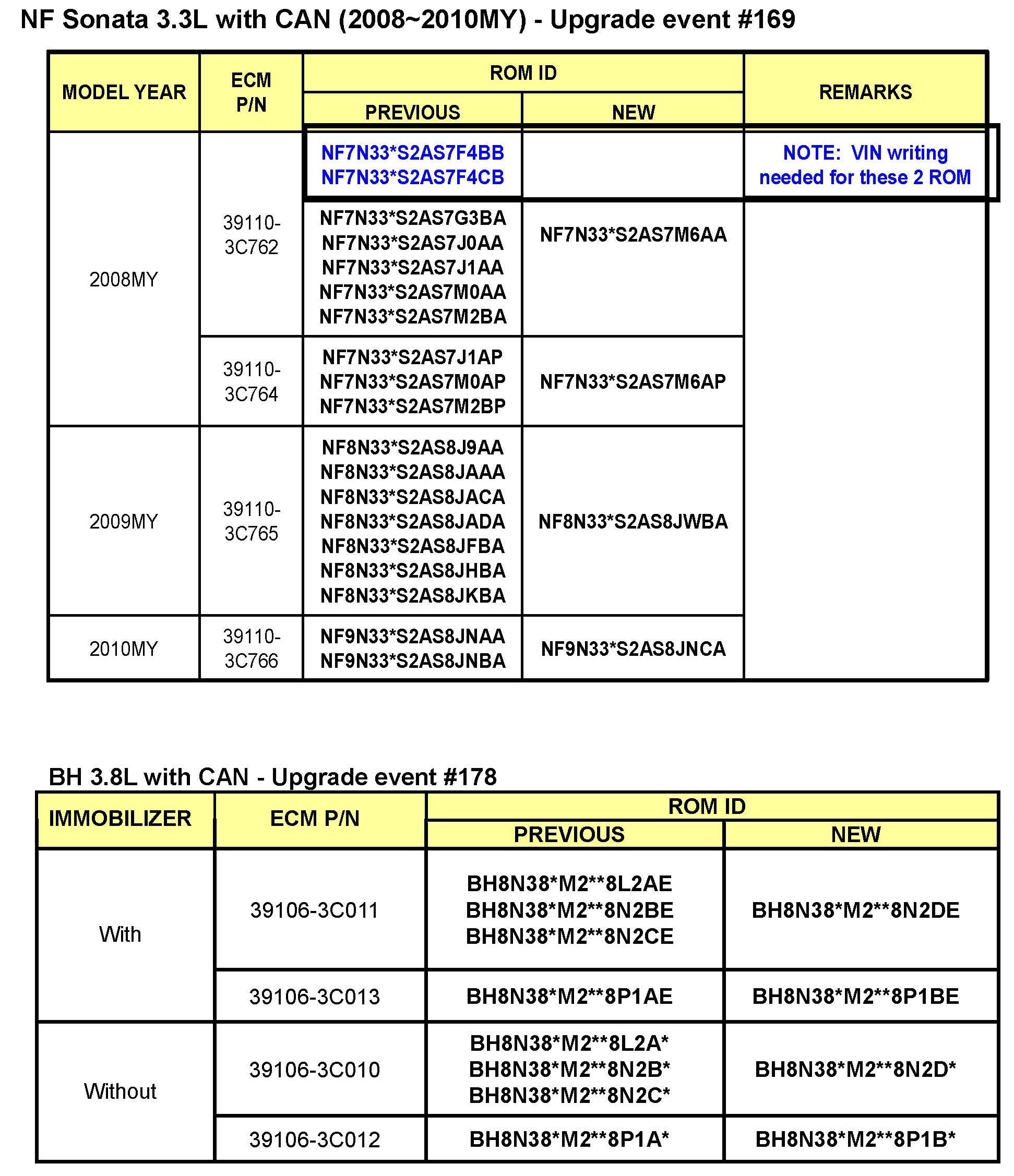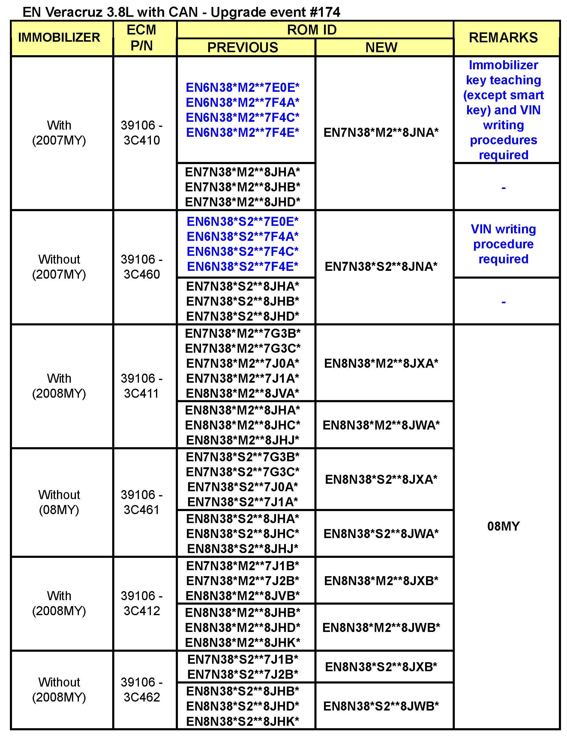 10. For EN Veracruz after update is completed, perform the VIN writing procedure or immobilizer key teaching procedure on the affected vehicles where it is referenced in the "ECM ROM ID INFORMATION "table earlier in this TSB.