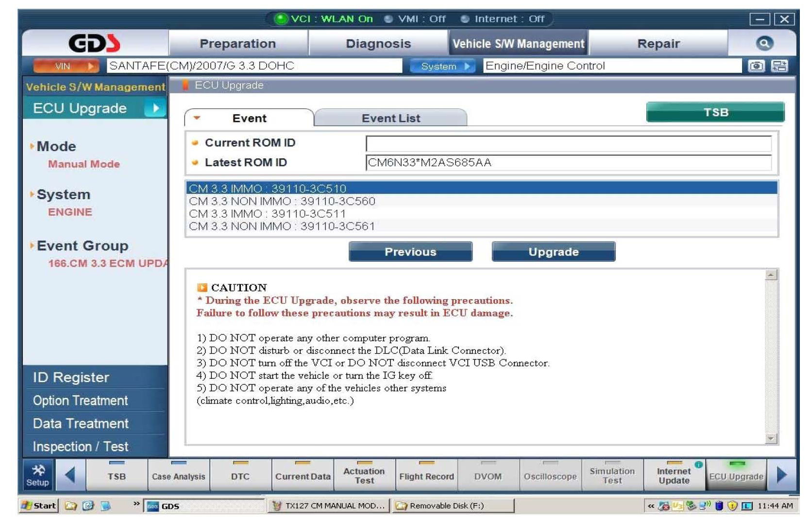 3. Select the appropriate control unit part number with reference to the ROM ID Information Table and then perform Upgrade.