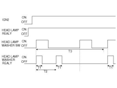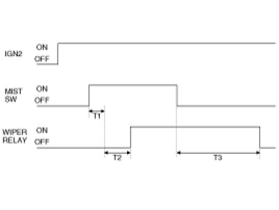 (2) If the Washer SW is ON in the IGN2 SW ON state, then the Wiper output shall be ON after T1, and if the Washer SW is ON over 0.6 seconds, after the Washer SW is OFF and the Wiper output shall be ON for 2.5 - 3.8 seconds and then, the Wiper output shall be OFF. However, WASHER SW input shall be disregarded during the Washer Wiper operating, but after the Washer Wiper operating, WASHER SW input be accepted first.