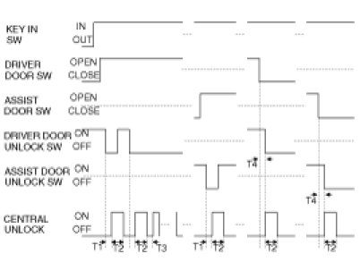 (4) If after the TUNLOCK signal is received, the DRIVER KEY UNLOCK SW is turned to ON from OFF within T1, the UNLOCK output shall be ON to all doors for T2.