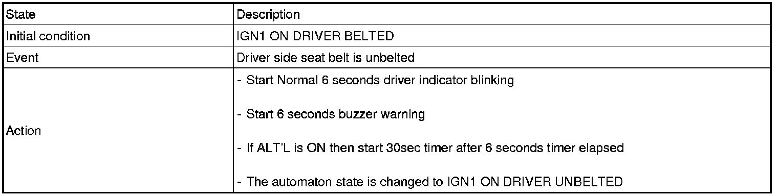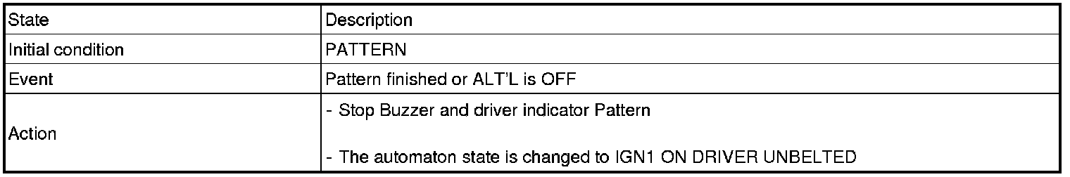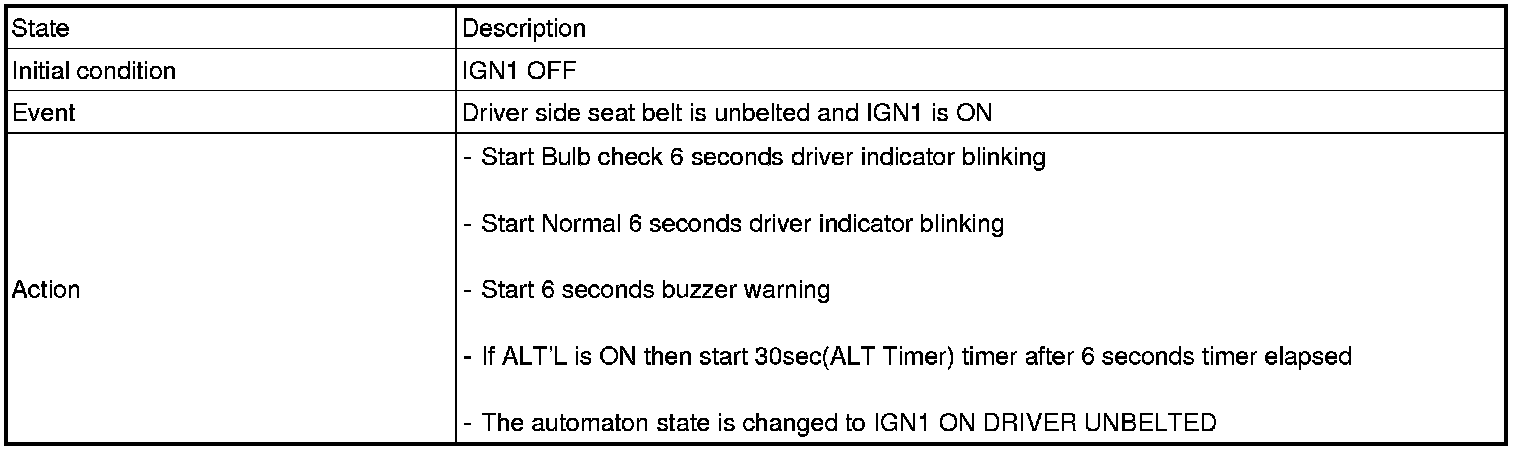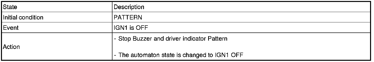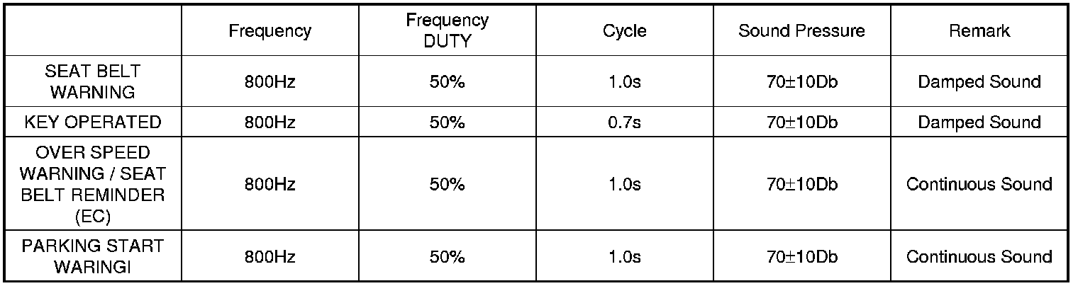 In the state that the IGN1 is ON or the Parking Brake is pulled, if the speed of vehicle is maintained over 10 km/h for 2 - 3 seconds or more, then the Chime Buzzer output shall be continued with 1 second cycle of the ON/OFF (0.3/0.7 seconds). But, after the speed of vehicle is maintained over 10 km/h for 2 - 3 seconds or more, if the Parking Brake is pulled, output immediately.