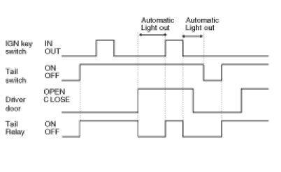 (3) TAIL RELAY is turned OFF(AUTO CUT) if the state is changed from IGN KEY switch = IN & TAIL switch = ON to IGN KEY switch = OUT & TAIL switch = ON & Driver DOOR = OPEN.(automatic light out)