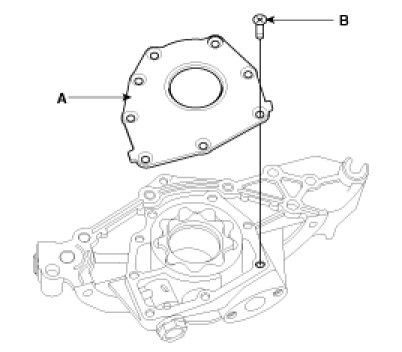 (2) Install the oil pump cover(A) to front case with the 8screws(B).
