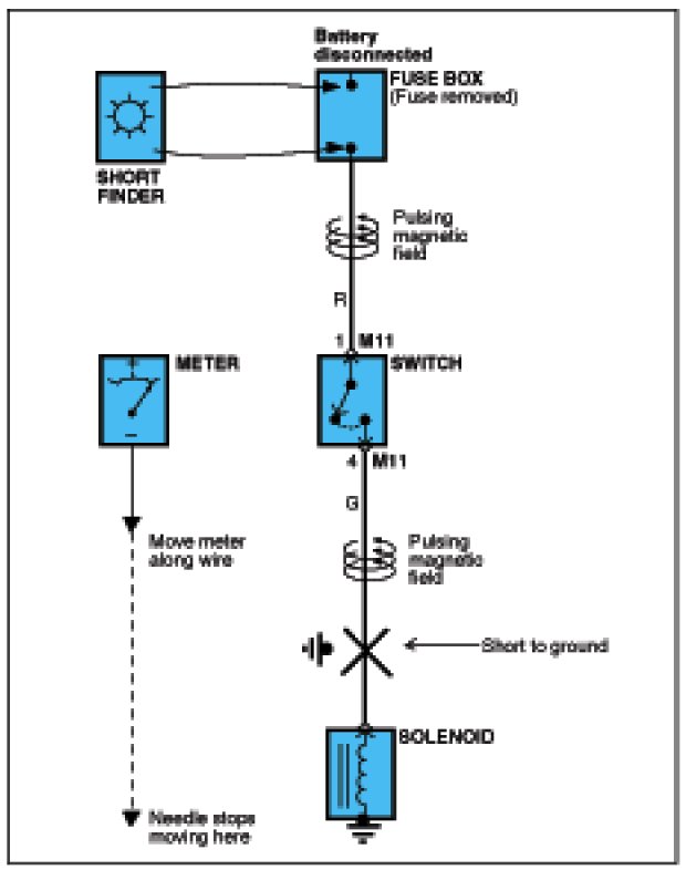 A short finder is available to locate a short to ground. The short finder creates a pulsing magnetic field in the shorted circuit and shows you the location of the short trough body trim or sheet metal.