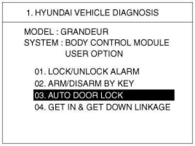 The BCM offers 4 items user option mode for a user convenience (LOCK/UNLOCK ALARM, AUTO DOOR LOCK, GET IN & GET DOWN LINKAGE, ARM/DISARM BY KEY)