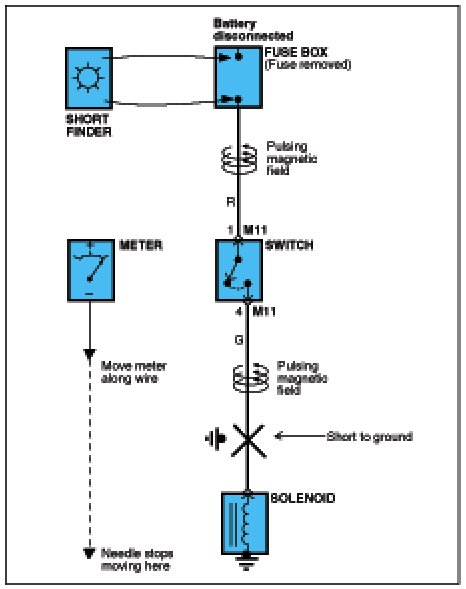 A short finder is available to locate a short to ground. The short finder creates a pulsing magnetic field in the shorted circuit and shows you the location of the short trough body trim or sheet metal.