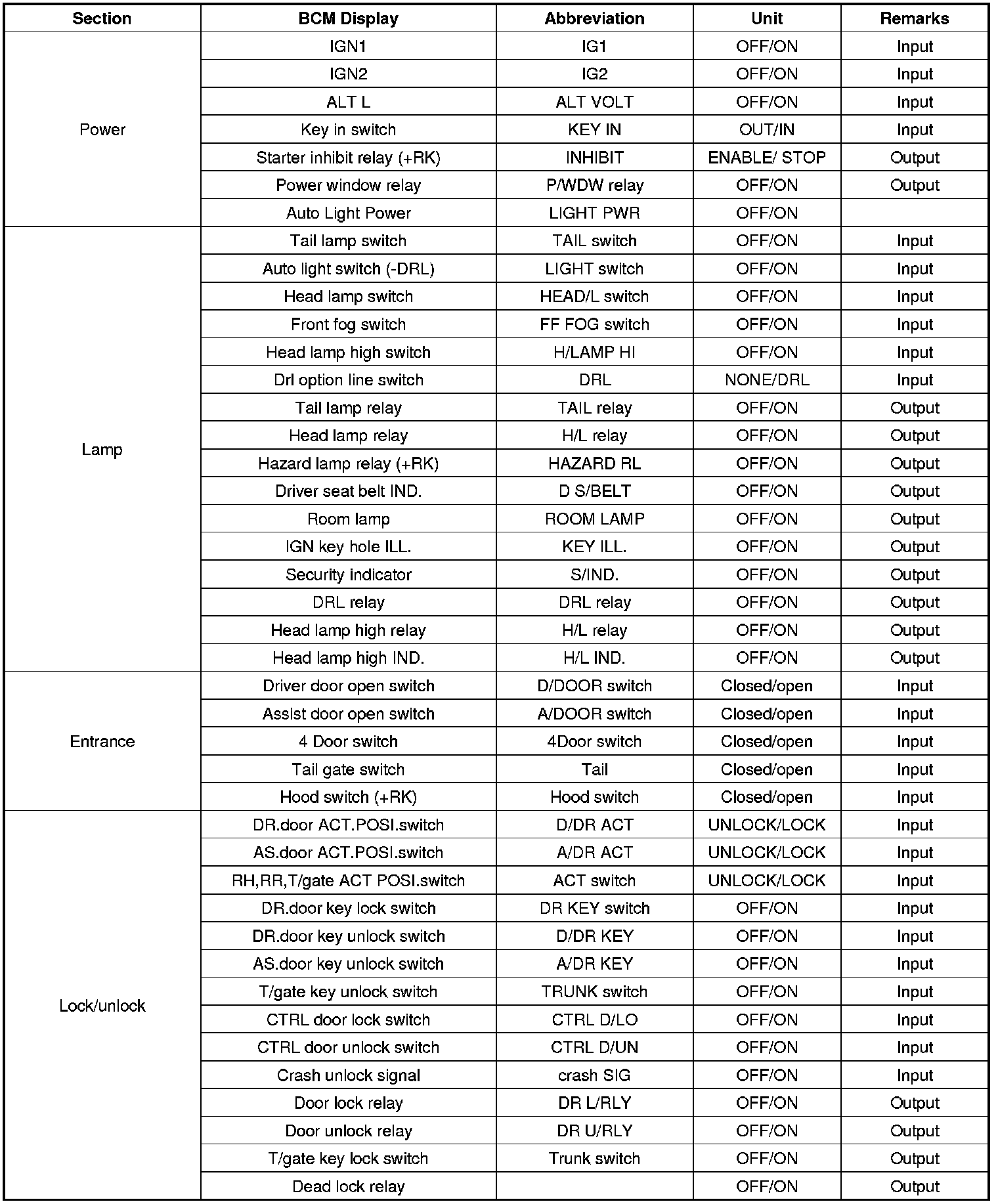 BCM Input/output Specification