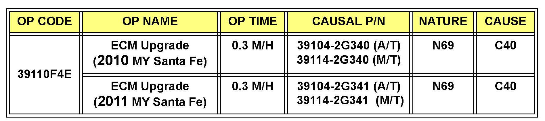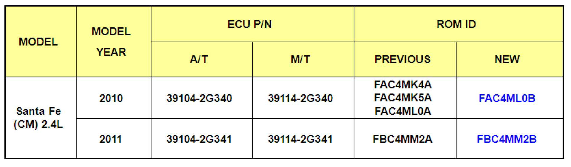 This bulletin provides the procedure to update the Engine Control Module (ECM) of some 2010-2011 MY SANTA FE (CM) 2.4L vehicles which may experience malfunction indicator lamp illuminated with the ECM (Electronic Control Module) system-related DTC P0441.