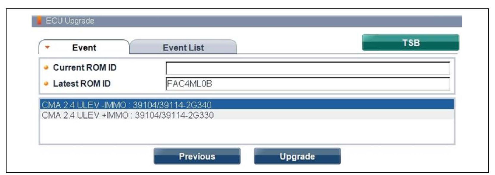 7. After the Current ROM ID is displayed, select the Update Event "218.CMA 2.4 P0441 DTC LOGIC IMPROVEMENT."
