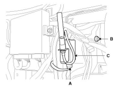 4. After loosening the mounting nut (B), disconnect the connector (A) and remove the receiver (C).