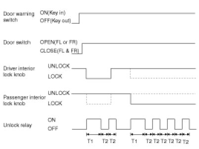 1. If the door switch of driver side or passenger side is locked when door warning switch is turned on and ( CAN communication reception), driver side or passenger side door is open, it executes unlock output for 1 second. If the passenger side door remains locked even after the unlock output, it repeats on and off 3 times with the time interval of 0.5 second.