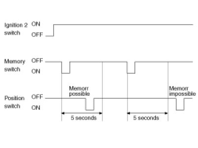 1. If position switch (POS1 or POS2) is pressed within 5 seconds after pressing the memory switch under ignition 2 on, it registers current mirror position. (Switch module sends in LIN communication). (Memory permit status lasts for 5 seconds after memory switch ON. After 5 seconds, memory permits status terminates. In other words, current position is registered if the position switch (POS1 or POS2) is turned on, during the memory permit status). However, RH side mirror position is not registered during the LH side mirror manual switch operation.