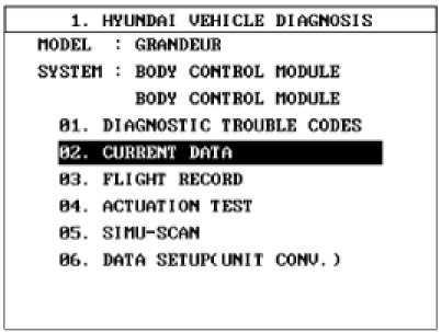 3. Select "Current data", if you will check current data of BCM. It provides power supply status, multi function status, lamp status, door status, lock system status, wiper, auto light status and so on.