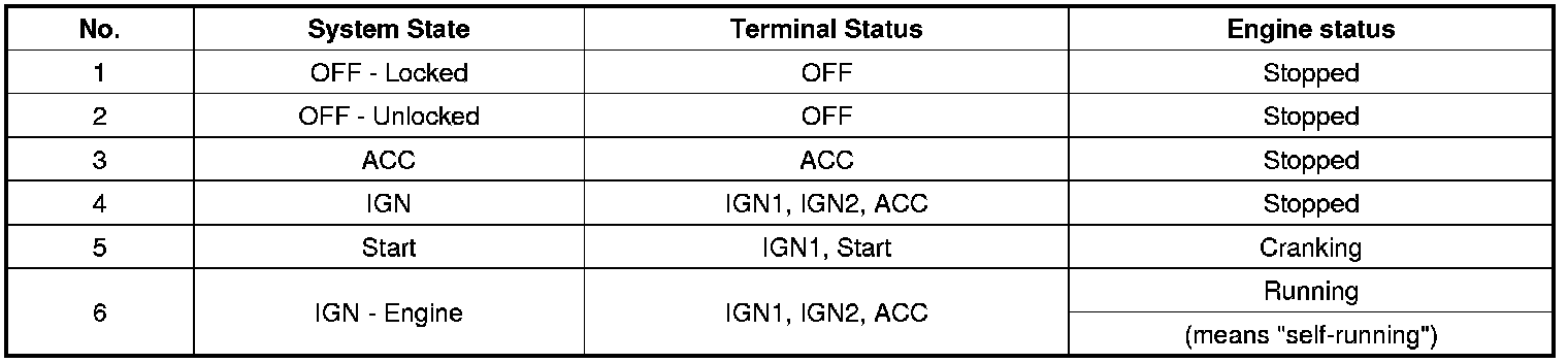 Referring to the terminals, the system states described in the table above are same as those one found in a system based on a mechanical ignition switch. The one of distinction with Mechanical-Ignition-Switch based system is that the BES system allows specific transition from [OFF] to [START] without going through [ACC] and [IGN] states.