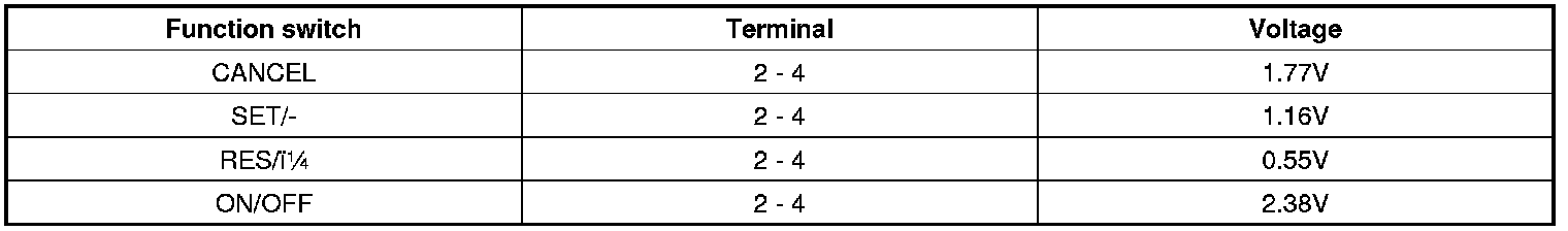 2. Measure voltage between terminals on the harness side connector when each function switch is ON (switch is depressed).