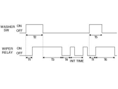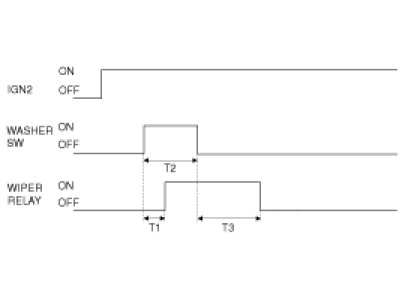 (2) If the Washer SW is ON in the IGN2 SW ON state, then the Wiper output shall be ON after T1, and if the Washer SW is ON over 0.6 seconds, after the Washer SW is OFF and the Wiper output shall be ON for 2.5 - 3.8 seconds and then, the Wiper output shall be OFF. However, WASHER SW input shall be disregarded during the Washer Wiper operating, but after the Washer Wiper operating, WASHER SW input be accepted first.
