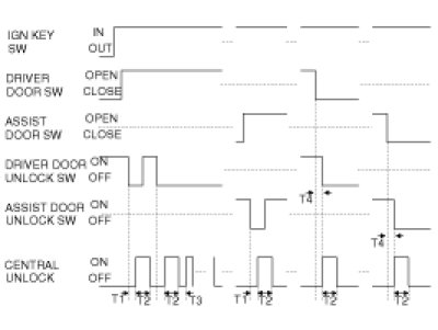 (4) If after the TUNLOCK signal is received, and after the DRIVER KEY UNLOCK SW is turned to ON from OFF (Driver door lock sw become UNLOCK, and BCM does not operate) within T1, actuator unlock sw is UNLOCK in 3s, the UNLOCK output shall be ON to all doors for T2.