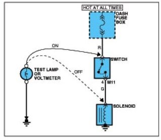 A. Connect one lead of a test lamp or voltmeter to a ground. If you are using a voltmeter, be sure it is the voltmeter's negative test lead you have connected to ground.