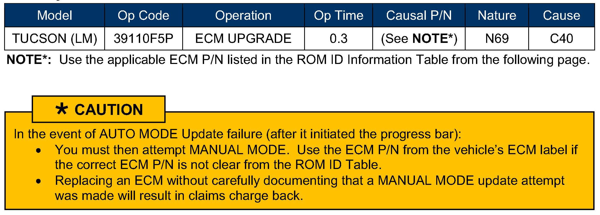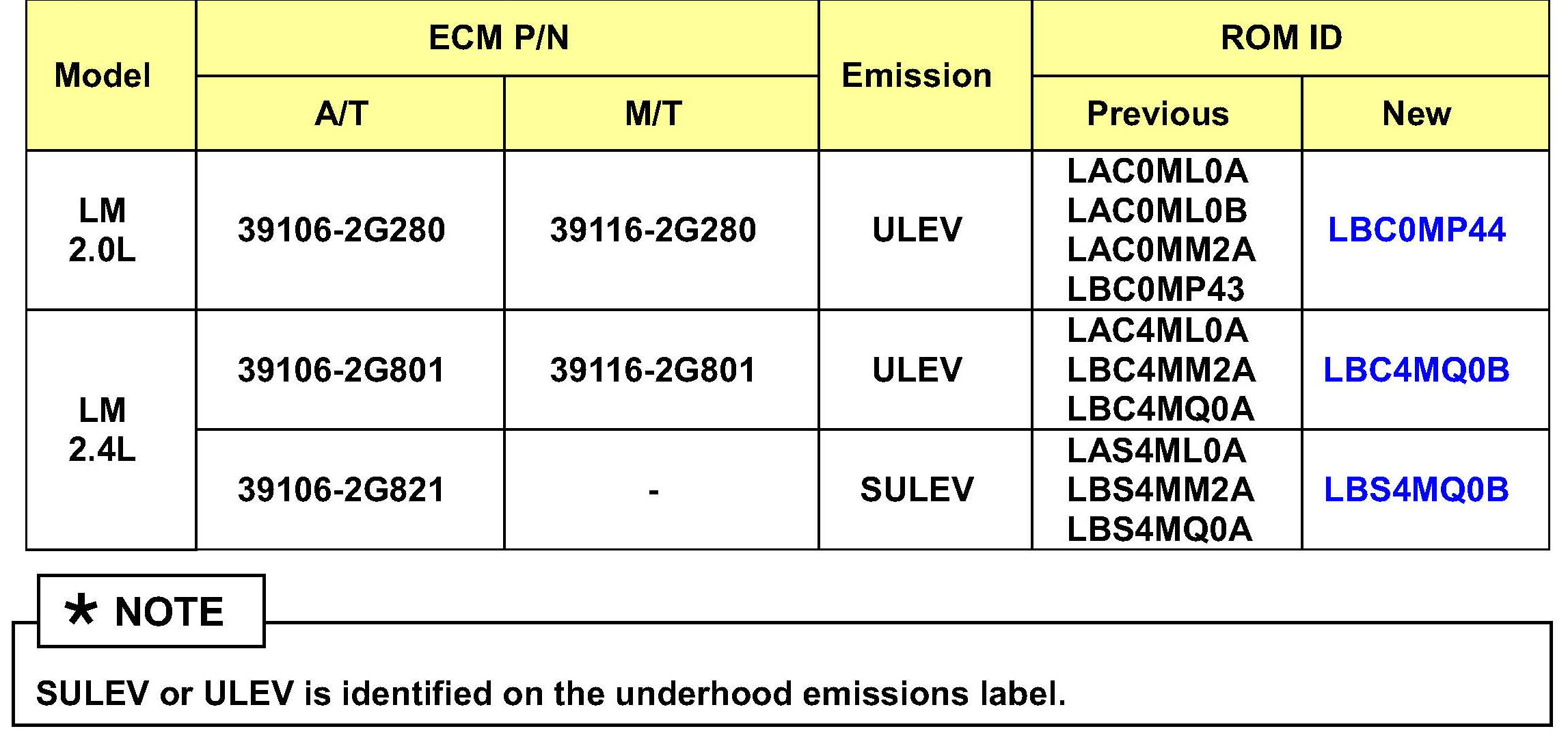 Verity the ECM ROM ID before updating the vehicle software. Refer to the table.