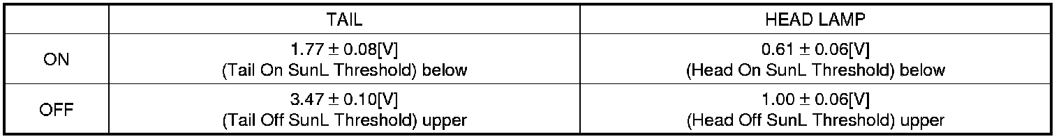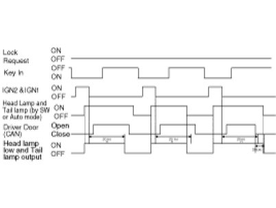 In the state of IGN1 ON and IGN2 ON, when MULTI FUNCTION switch module detects AUTO LIGHT switch ON, TAIL LAMP RELAY output and HEAD LAMP LOW RELAY output are controlled according to AUTO LIGHT Sensor's INPUT. In the state of IGN1 ON, when MULTI FUNCTION switch module detects AUTO LIGHT switch ON, TAIL LAMP RELAY output is controlled according to AUTO LIGHT Sensor's INPUT.