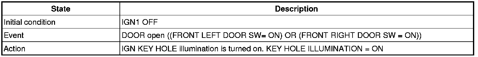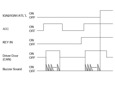 A. (While IGN KEY is inserted into the KEY CYLINDER (*) Or ACC is ON) & (IGN1 = IGN2 = ALT'L = OFF) if DRIVER SIDE DOOR is opened. KEY OPERATED WARN'G starts.