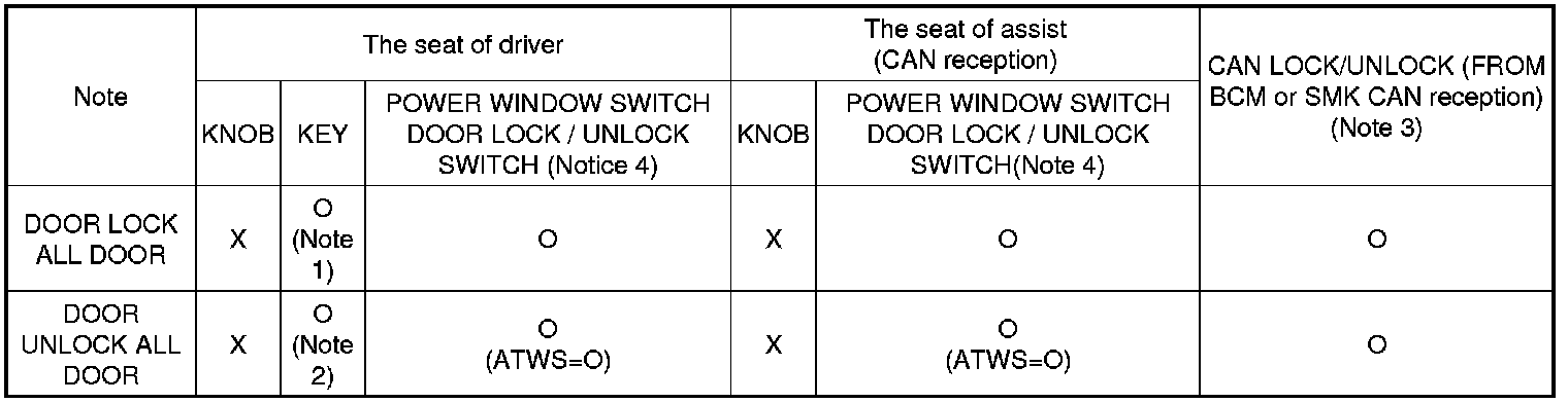 (1) It output UNLOCK in case of driver's DOOR UNLOCK KNOB change to UNLOCK from LOCK in all DOOR CLOSE states(0.5 ±0.1sec). AUTO DOOR UNLOCK(connecting to driver's seat) input condition at AUTO DOOR UNLOCK (CONNECTING TO A SPEED LEVER) output is ignored.