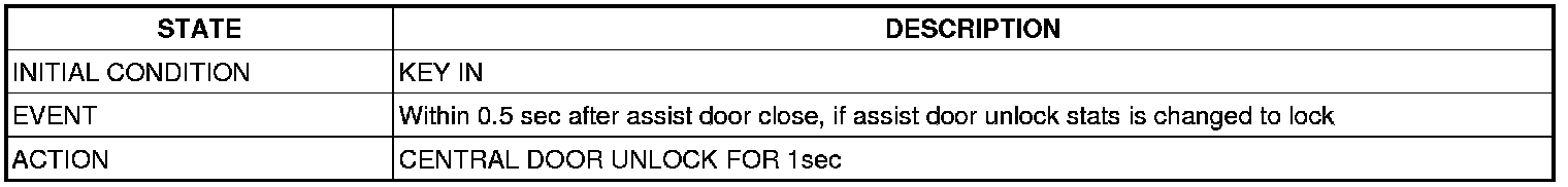 (1) When the IGN1 is ON, if the vehicle speed is changed over 40km/h from under (the signal shall be transferred to CAN from BCM), and if one door lock switch of the all door lock switch (FL, FR, RL, and RR) is UNLOCK, then the LOCK signal shall be output. (0.5±0.1 sec), If one door lock switch of the all door lock switch (FL, FR, RL, and RR) is UNLOCK after LOCK signal is output, the LOCK OUTPUT (ON for 0.5±0.1sec, OFF for 0.5±0.1sec) shall be output at most 3 times (totally 4 times).