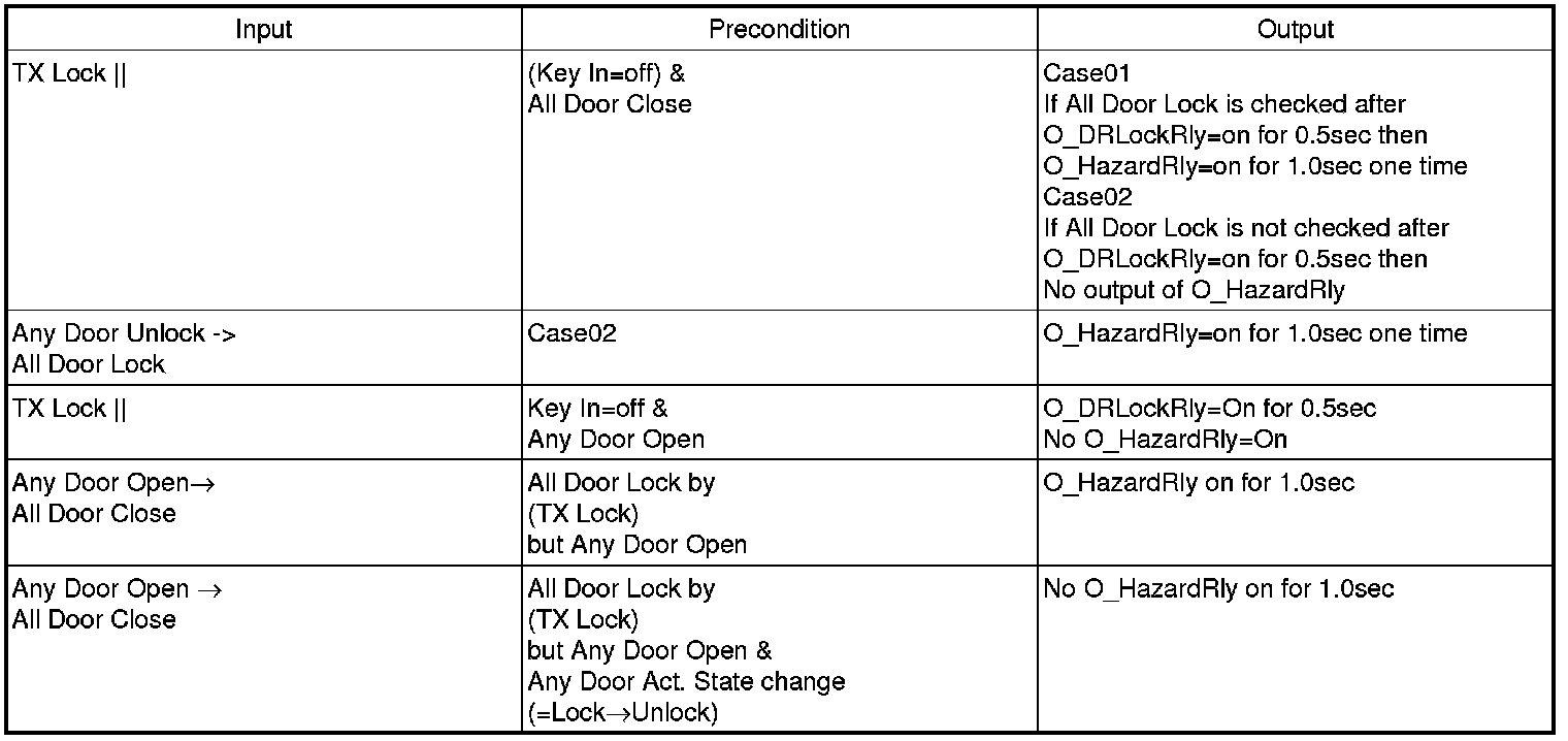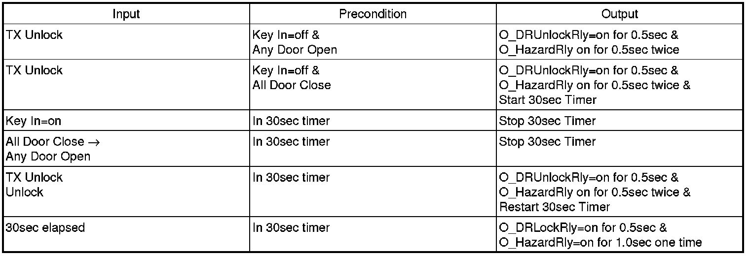 (11) After Unlock condition, and if the condition is not kept for 0.5sec, perform O_DRUnlockRly=on However, after L_DRVDRUnlockSW or L_ASTDRUnlockSW is meeting with the condition by Unlock->Lock and after 0.5sec, and if Key In=off do not perform O_DRUnlockRly=on