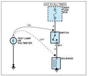 A. Connect one lead of a test lamp or voltmeter to a ground. If you are using a voltmeter, be sure it is the voltmeter's negative test lead you have connected to ground.