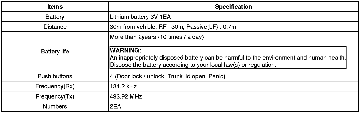 Keyless Starting System: Specifications