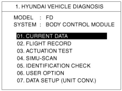 3. Select "Current data", if you will check current data of BCM. It provides power supply status, multi function status, lamp status, door status, lock system status, wiper, auto light status and so on.
