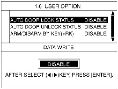 The BCM offers 3 items user option mode for a user convenience (AUTO Door Lock/Unlock, Door KEY ARM/Disarm