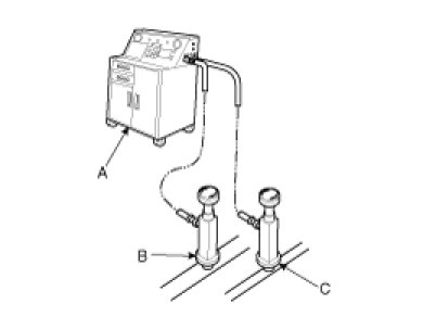 Recovery/Recycling/Charging System (A) to the high-pressure service port (B) and the low-pressure service port (C) as shown, following the equipment manufacturer's instructions.