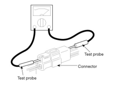 11. When using a circuit tester to check continuity or voltage on connector terminals, insert the test probe into the harness side. If the connector is a sealed connector, insert the test probe through the hole in the rubber cap until contacts the terminal, being careful not to damage the insulation of the wires.