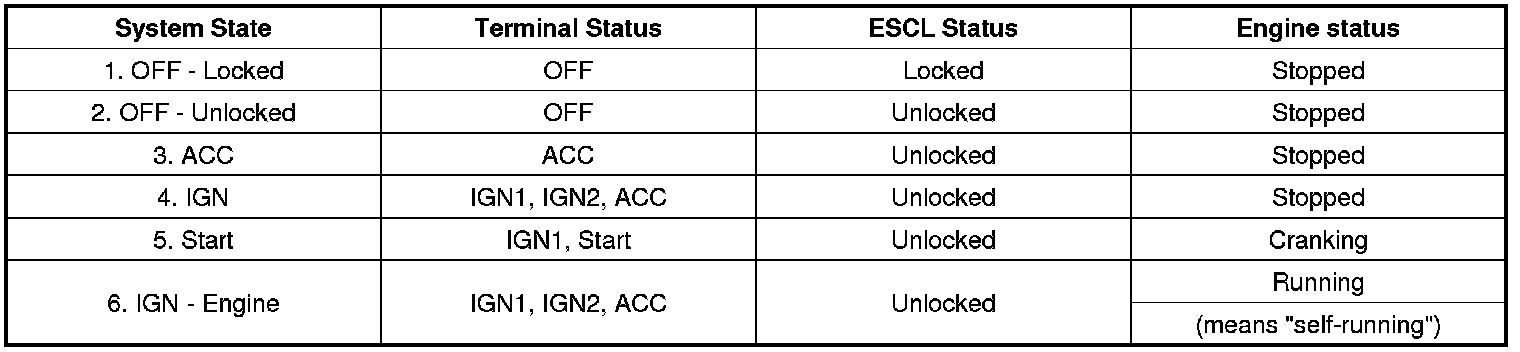 Referring to the terminals, the system states described in the table above are same as those one found in a system based on a mechanical ignition switch. The one of distinction with Mechanical-Ignition-Switch based system is that the BES system allows specific transition from [OFF] to [START] without going through [ACC] and [IGN] states.
