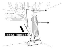 4. Remove the accelerator pedal in the direction of "Removal direction" in the figure after removing the installation bolt (B).
