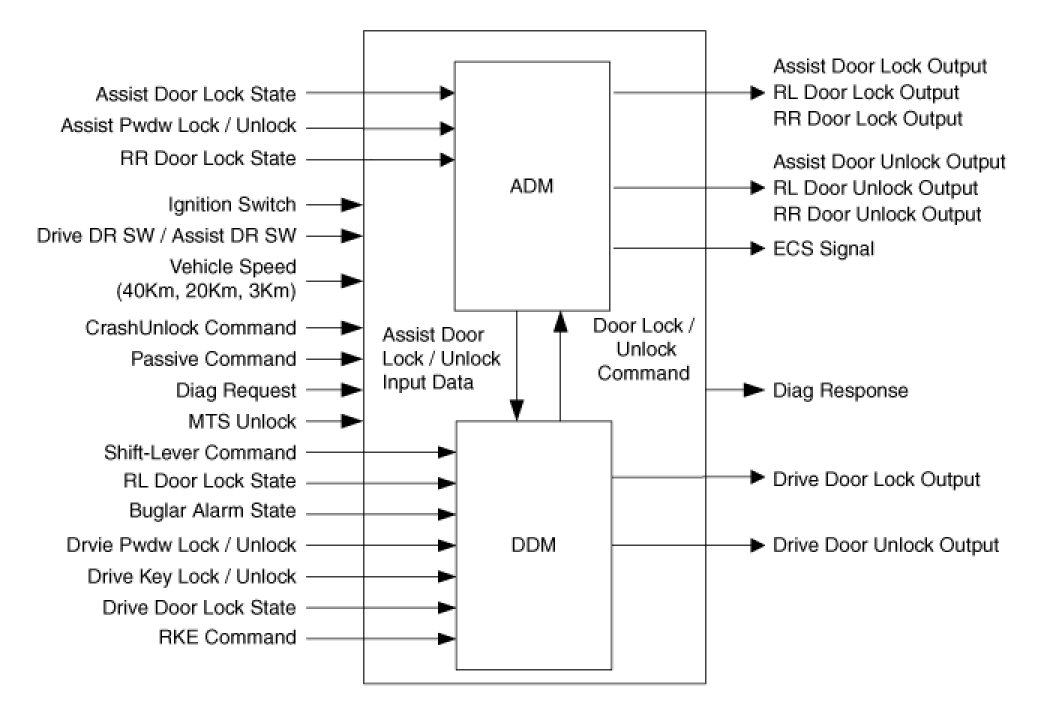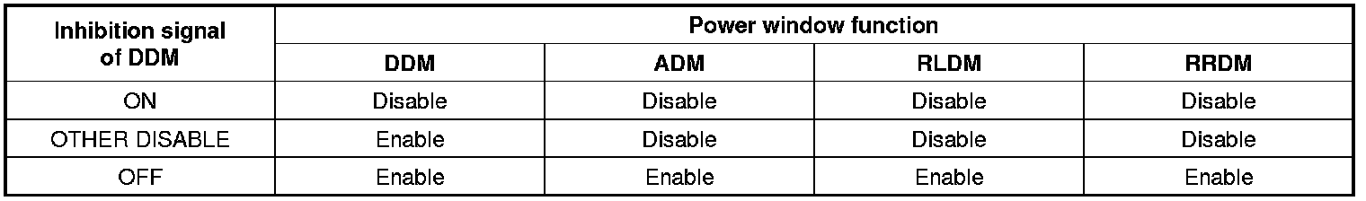 - Power Window Inhibition : ADM, RLDM and RRDM are inhibited by Power window Lock Switch