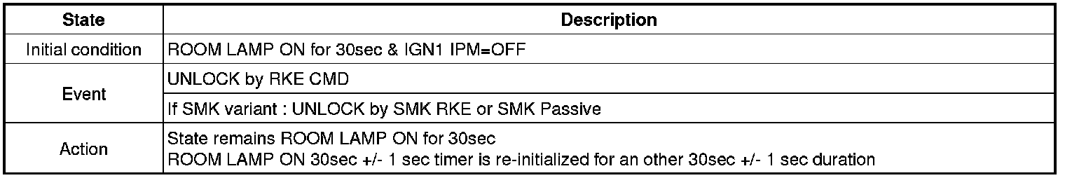 Any door opens at terminal OFF state without FOB in. After transition to all door closed within 500msec, if the valid Fob is in side car and all door locked then IPM transmits SMK key reminder warning 2 command (SMK Warning
