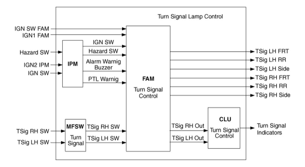 While IGN Switch FAM is IGN state, if Turn Signal RH Switch or Turn Signal LH Switch or Hazard switch is ON then turn signal outputs are turned ON following the switch input (LEFT, RIGHT or HAZARD).