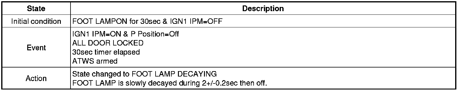 If the state of IGN Switch FAM is IGN or ST and Light Switch Status state is Auto Light Switch On, then TAIL LAMP RELAY output and HEAD LAMP LOW RELAY output are controlled by FAM with filtering time in accordance with Auto Light Out Status state change that is AUTO LIGHT Sensor's INPUT from IPM and according to specifications for each lamp described in below.
