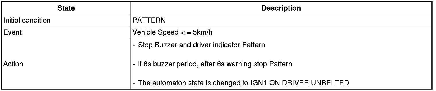 In the state that the IGN1 is ON or the Parking Brake is pulled, if the speed of vehicle is maintained over 10 km/h for 2 - 3 seconds or more, then the Chime Buzzer output shall be continued with 1 second cycle of the ON/OFF (0.3/0.7 seconds). But, after the speed of vehicle is maintained over 10 km/h for 2 - 3 seconds or more, if the Parking Brake is pulled, output immediately.