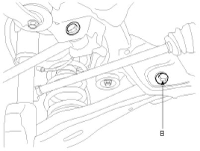 2. Adjust rear camber by turning the rear lower arm cam bolt (B) clockwise or counter clockwise. Rear camber adjustment should be made by turning the right and left cam bolt by the same amount.