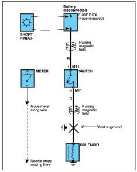 A short finder is available to locate a short to ground. The short finder creates a pulsing magnetic field in the shorted circuit and shows you the location of the short through body trim or sheet metal.