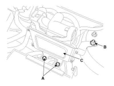 4. Remove the mounting bolts (A) and a nut (B), and then remove the ECM (C).