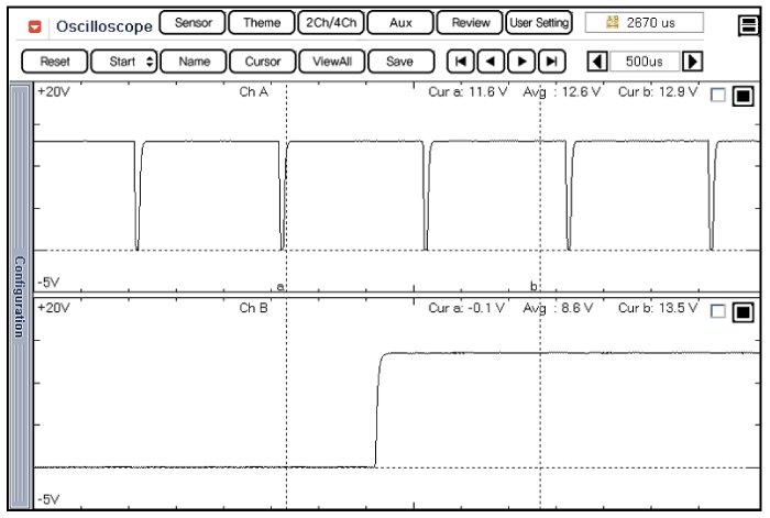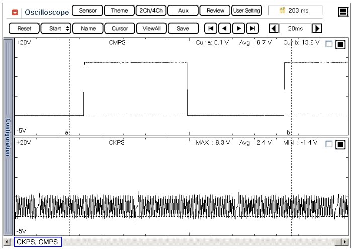 This example shows a typical Crankshaft Position Sensor(CkPS) and Camshaft Position Sensor(CMPS) waveform at idle.The PCM controls the injection and ignition timing by using these signals.