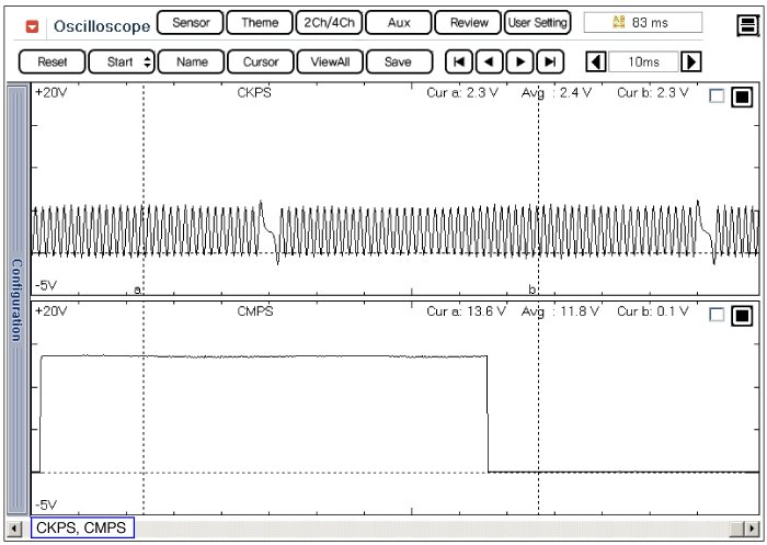 This example shows a typical Crankshaft Position Sensor (CKPS) and Camshaft Position Sensor (CMPS) waveform at idle.